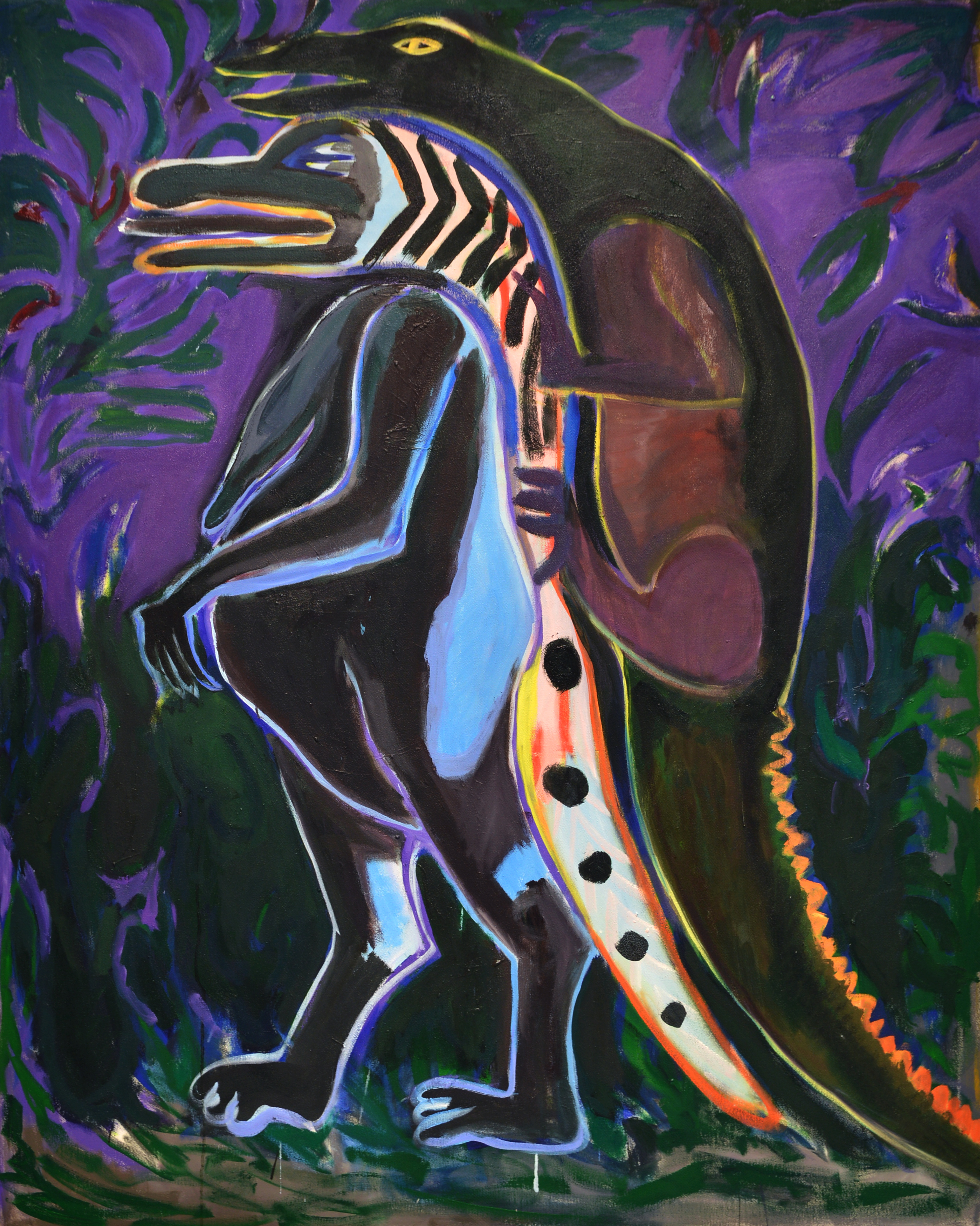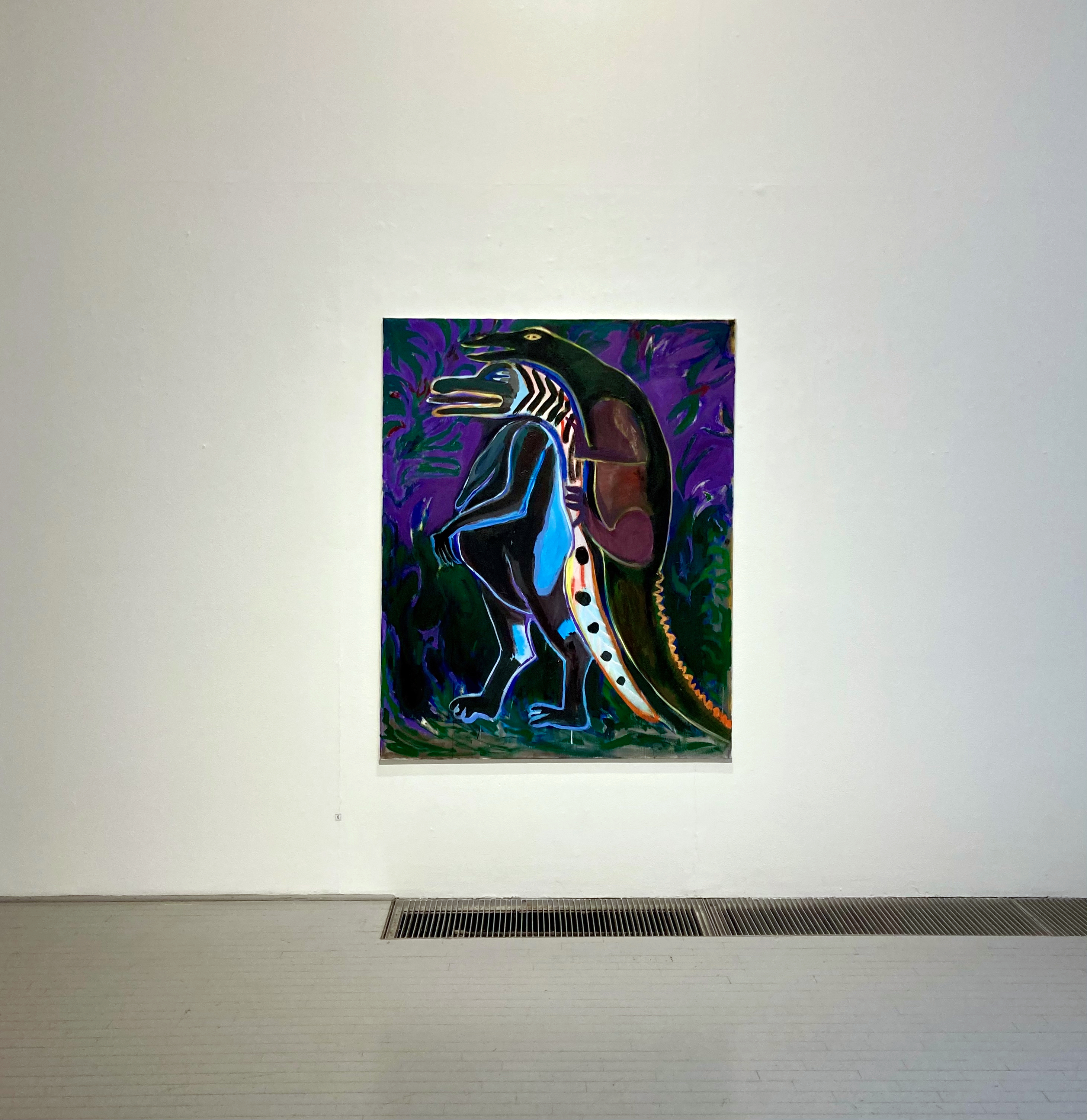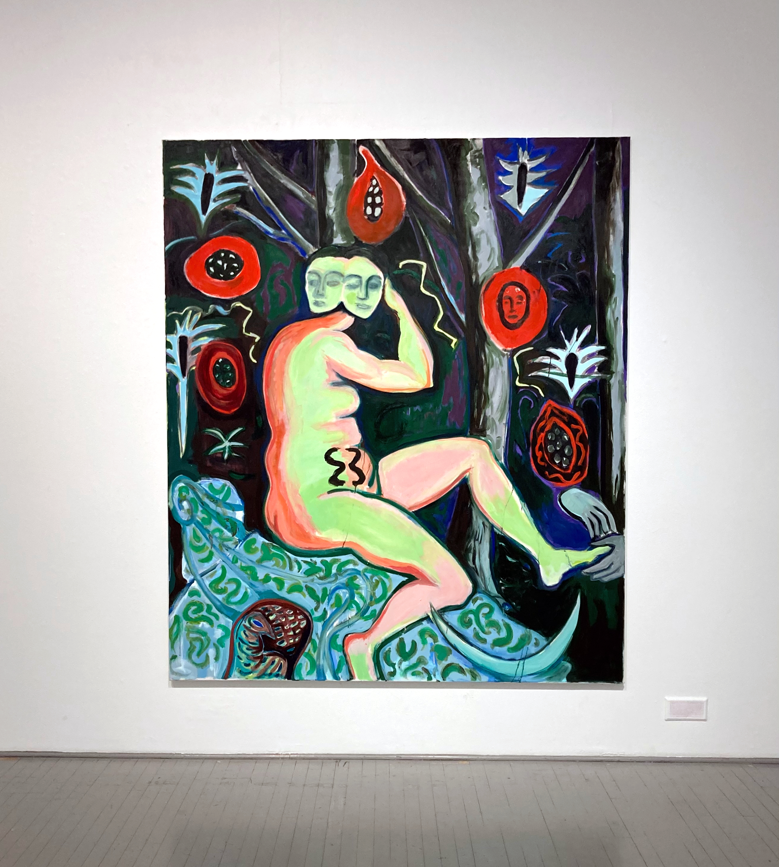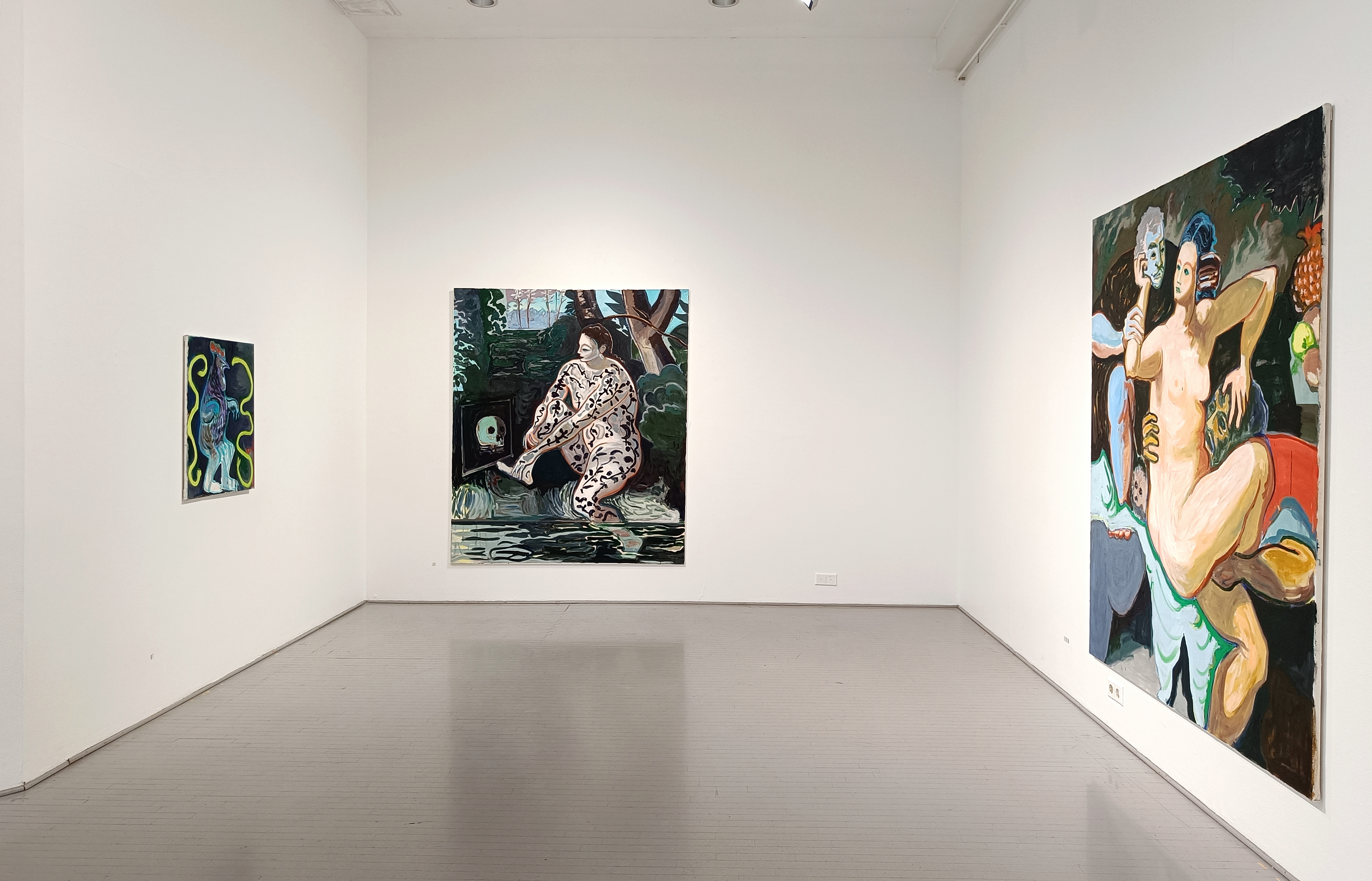 The bodies have taken on impossible proportions—human and animal forms have merged into something monstrous and comical. In these paintings, I wanted to turn Susanna inside out, to paint what is written between the lines. I often paint faces as masks, yet they do not conceal the inner conflicts: desires, fears, and obsessions seep to the surface.