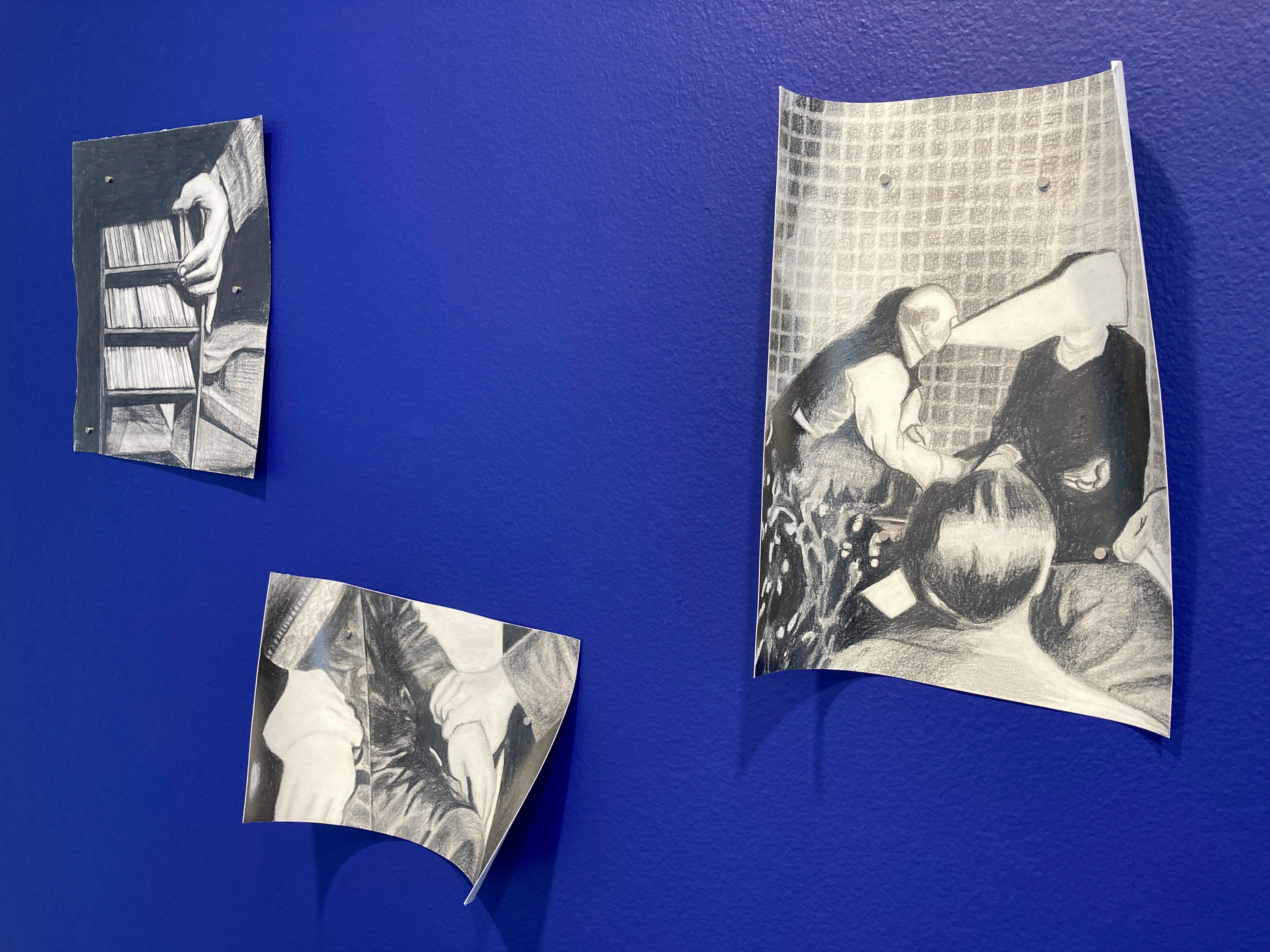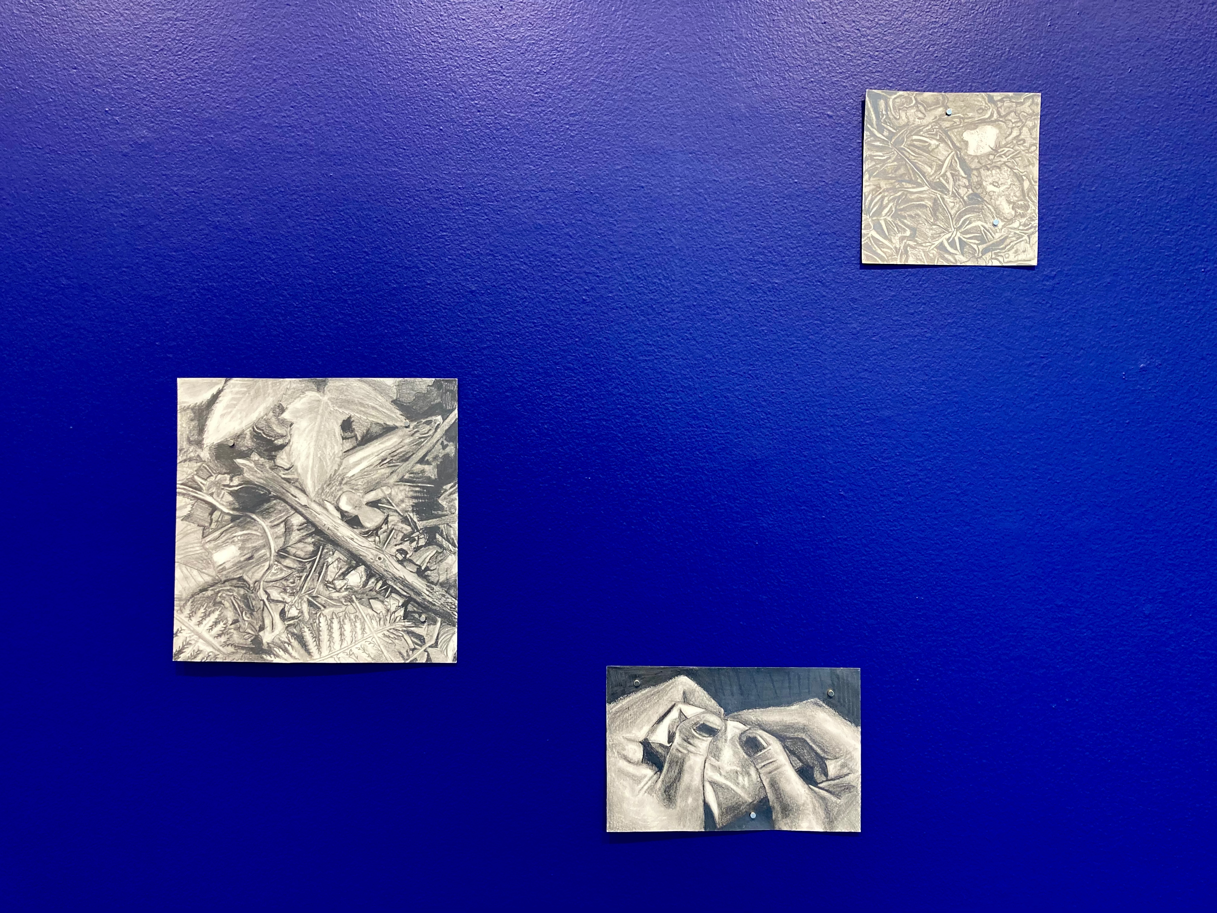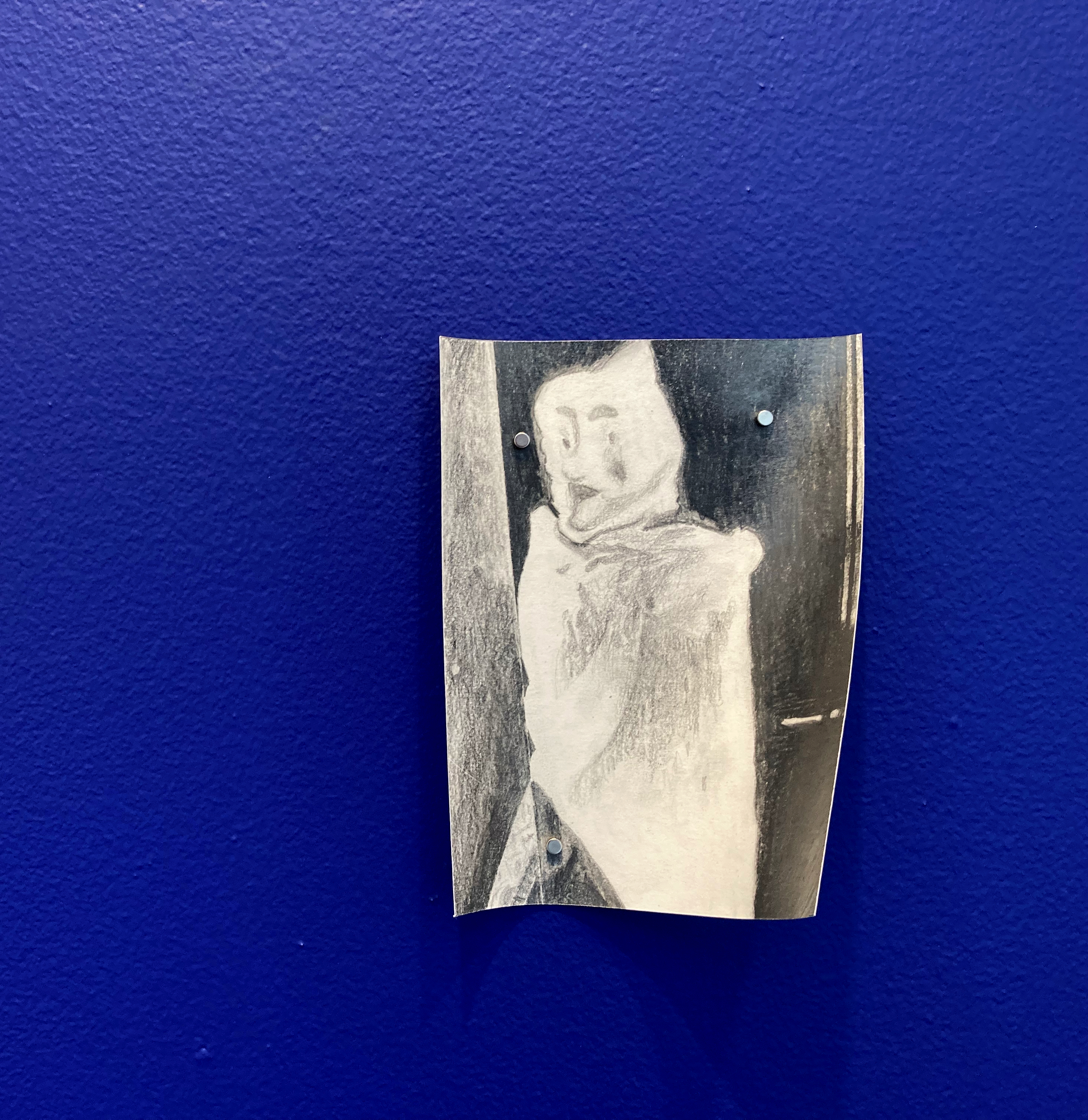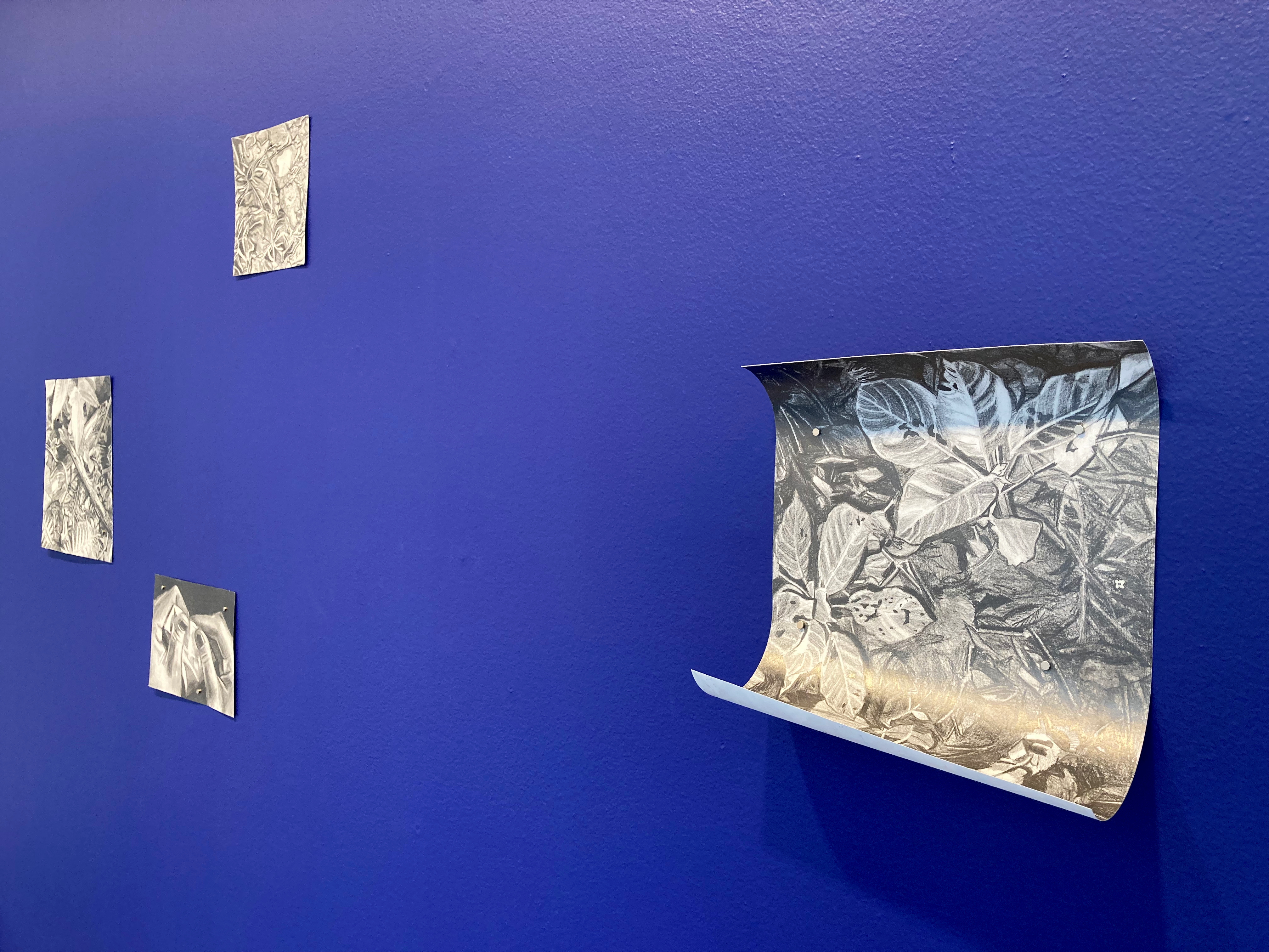 drawing installation: grahite drawings on paper, ultramarine blue wall paint, magnets.