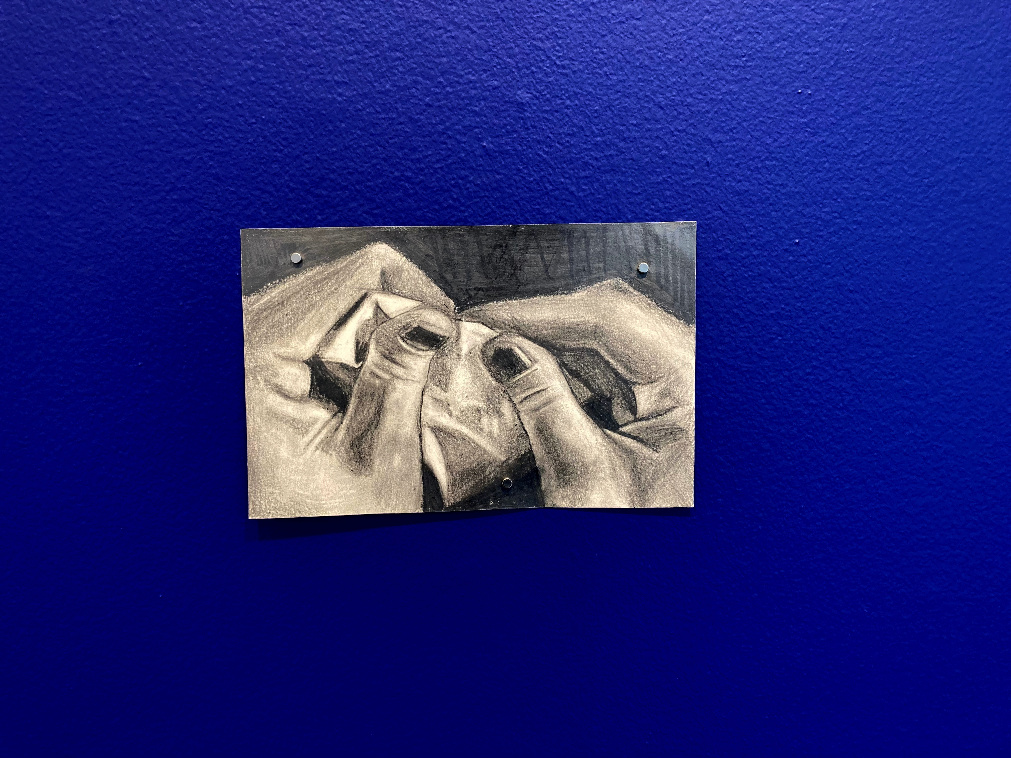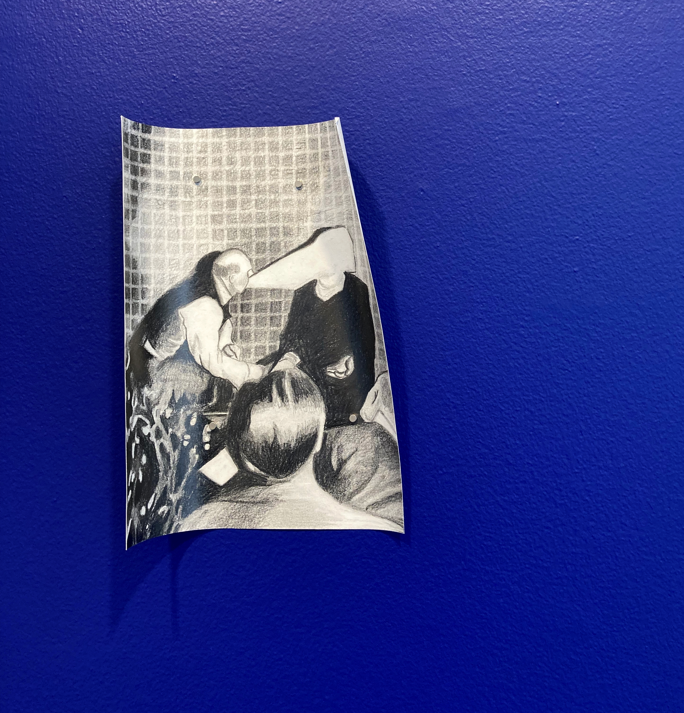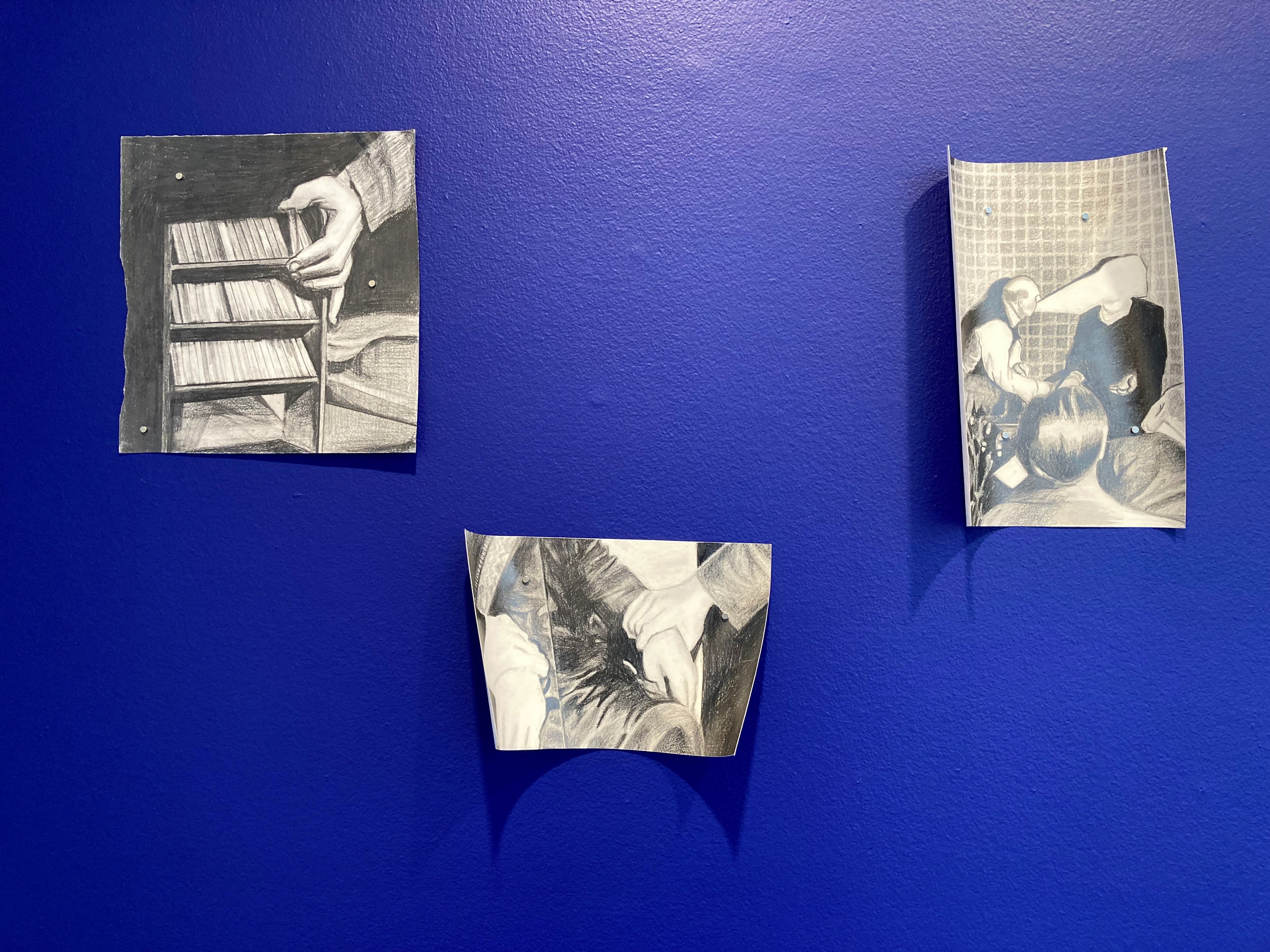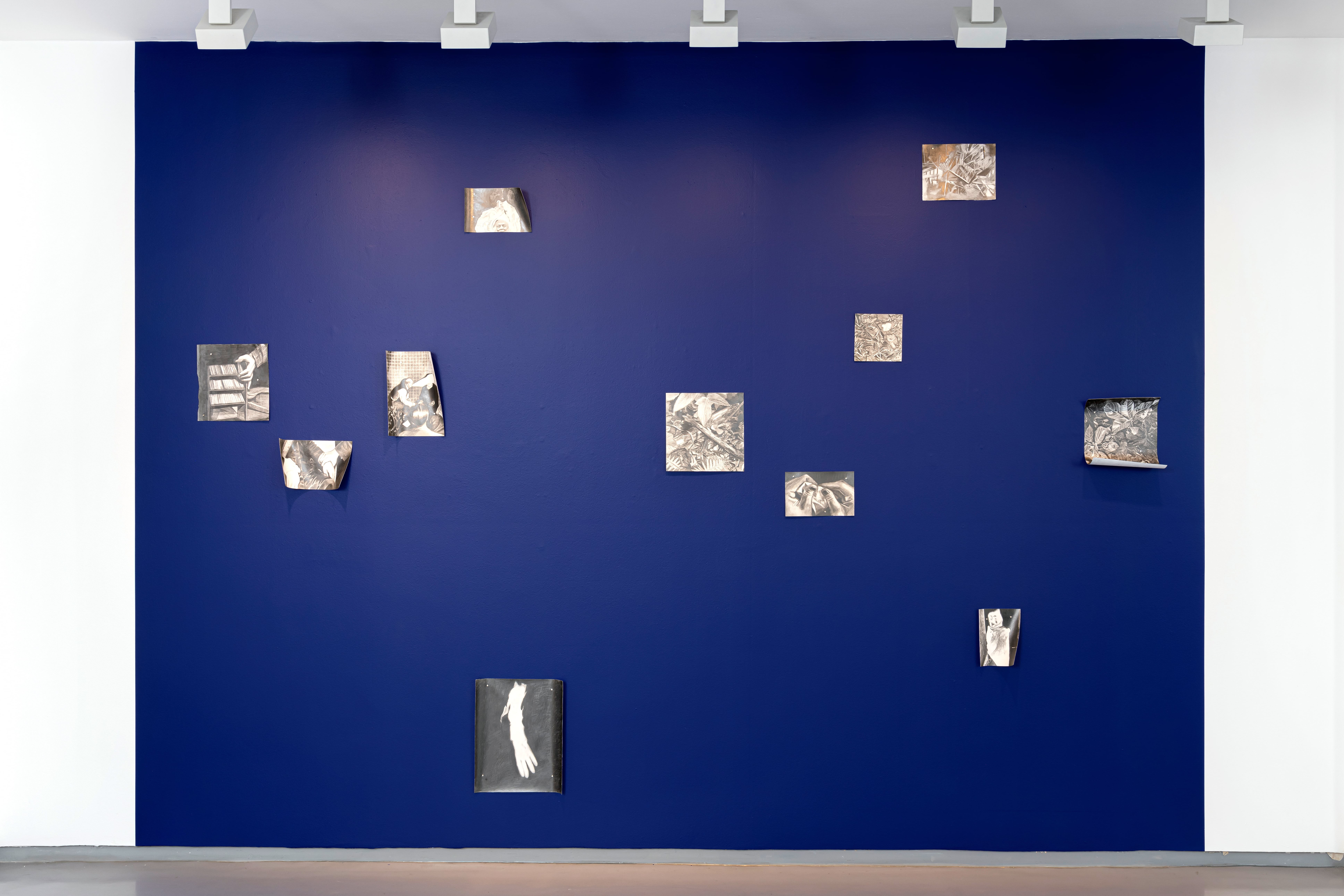 drawing installation: grahite drawings on paper, ultramarine blue wall paint, magnets.