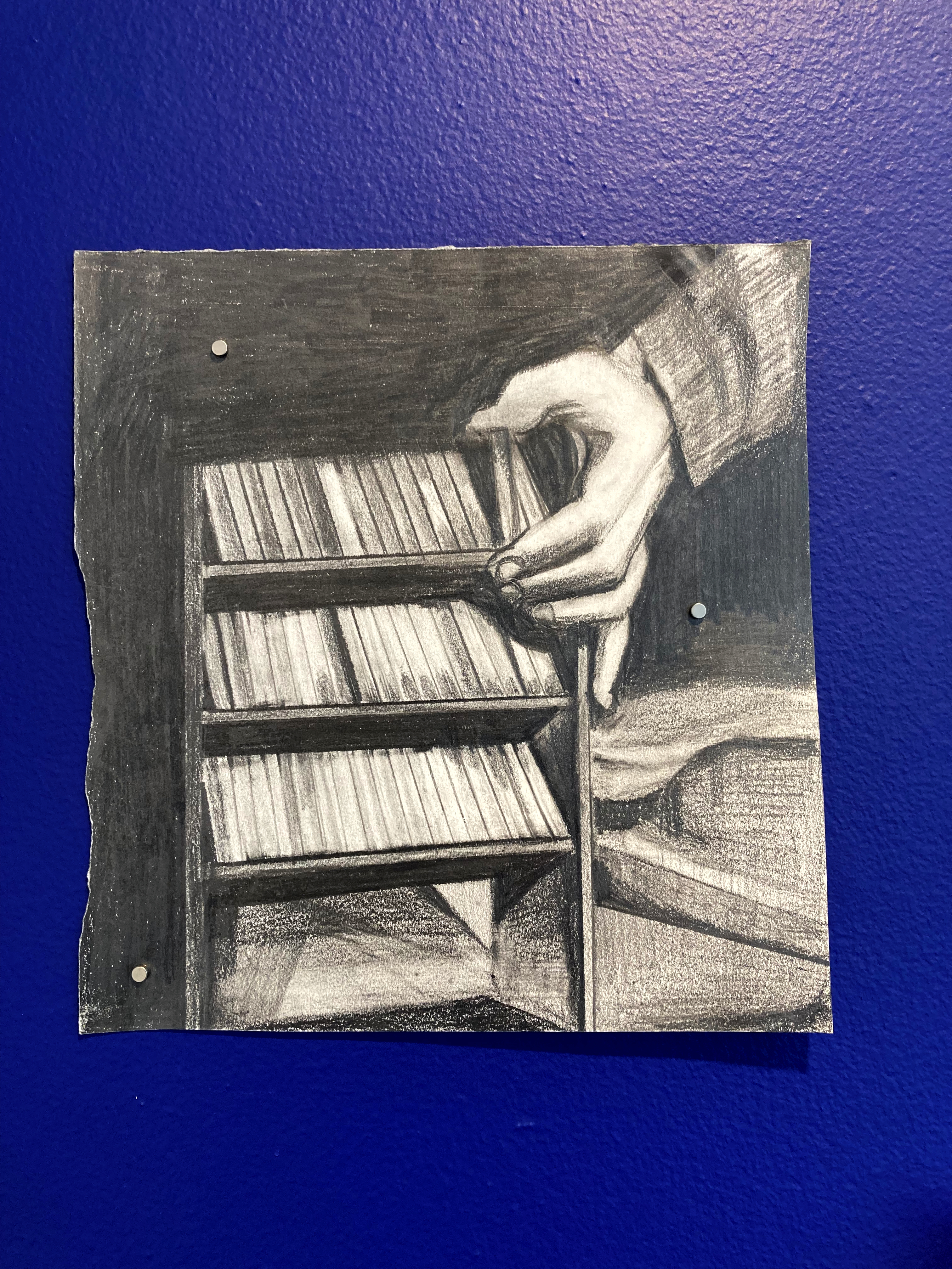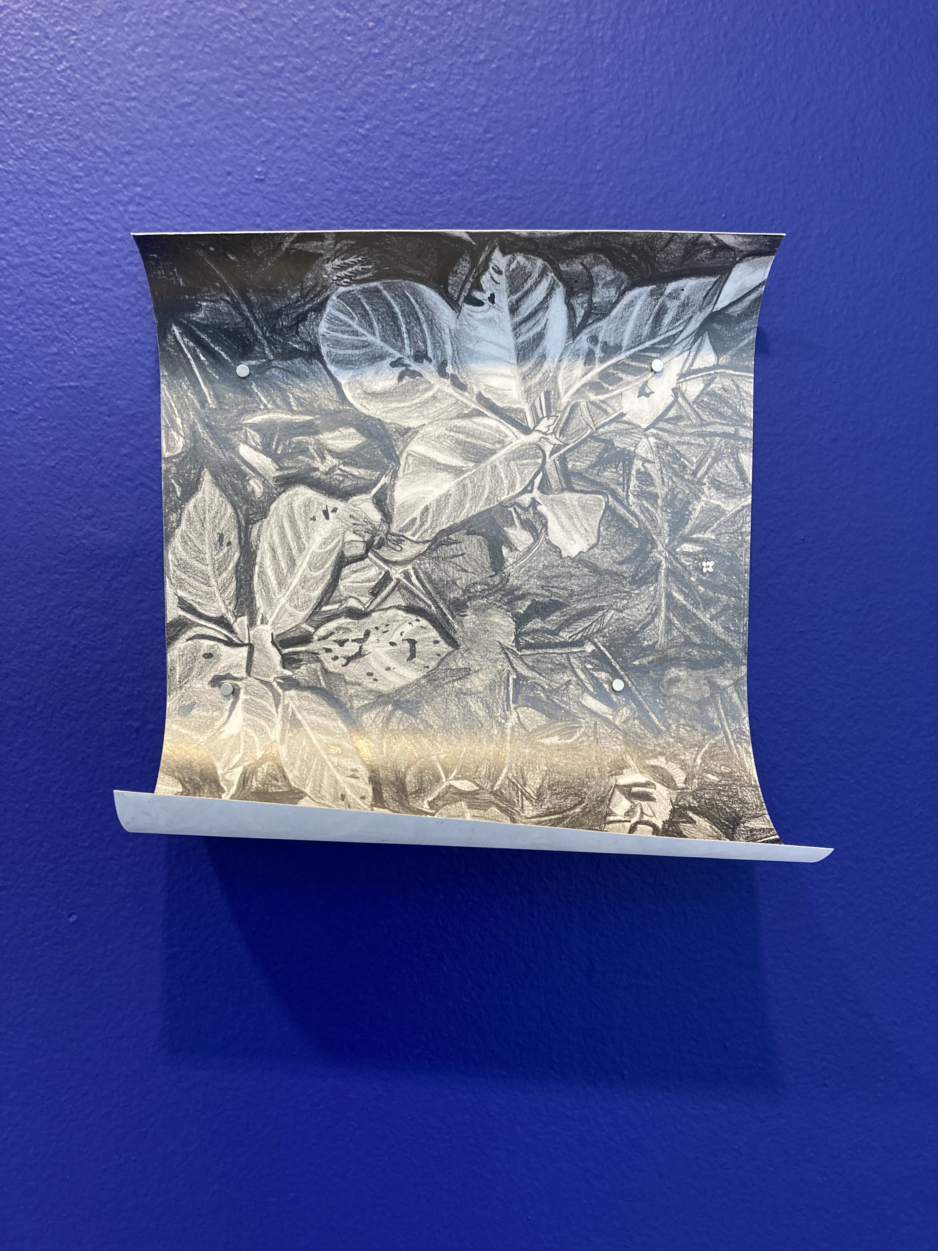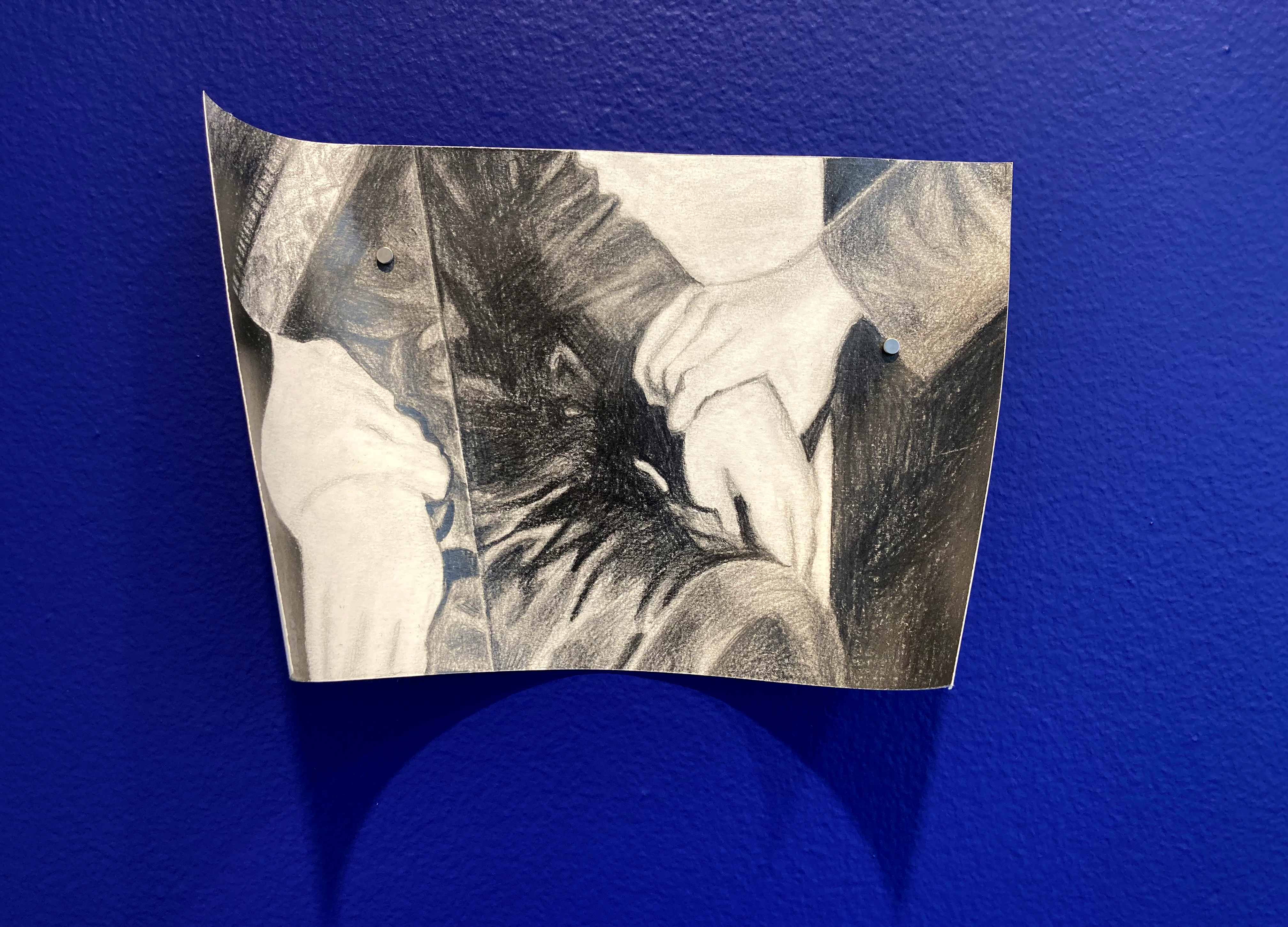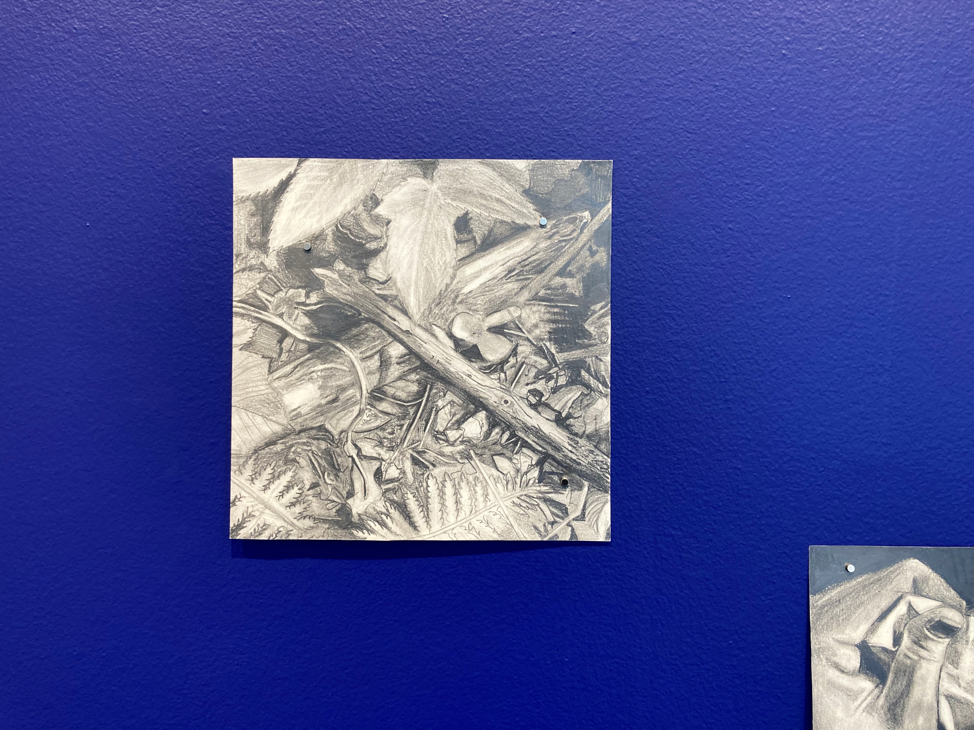 drawing installation: grahite drawings on paper, ultramarine blue wall paint, magnets.