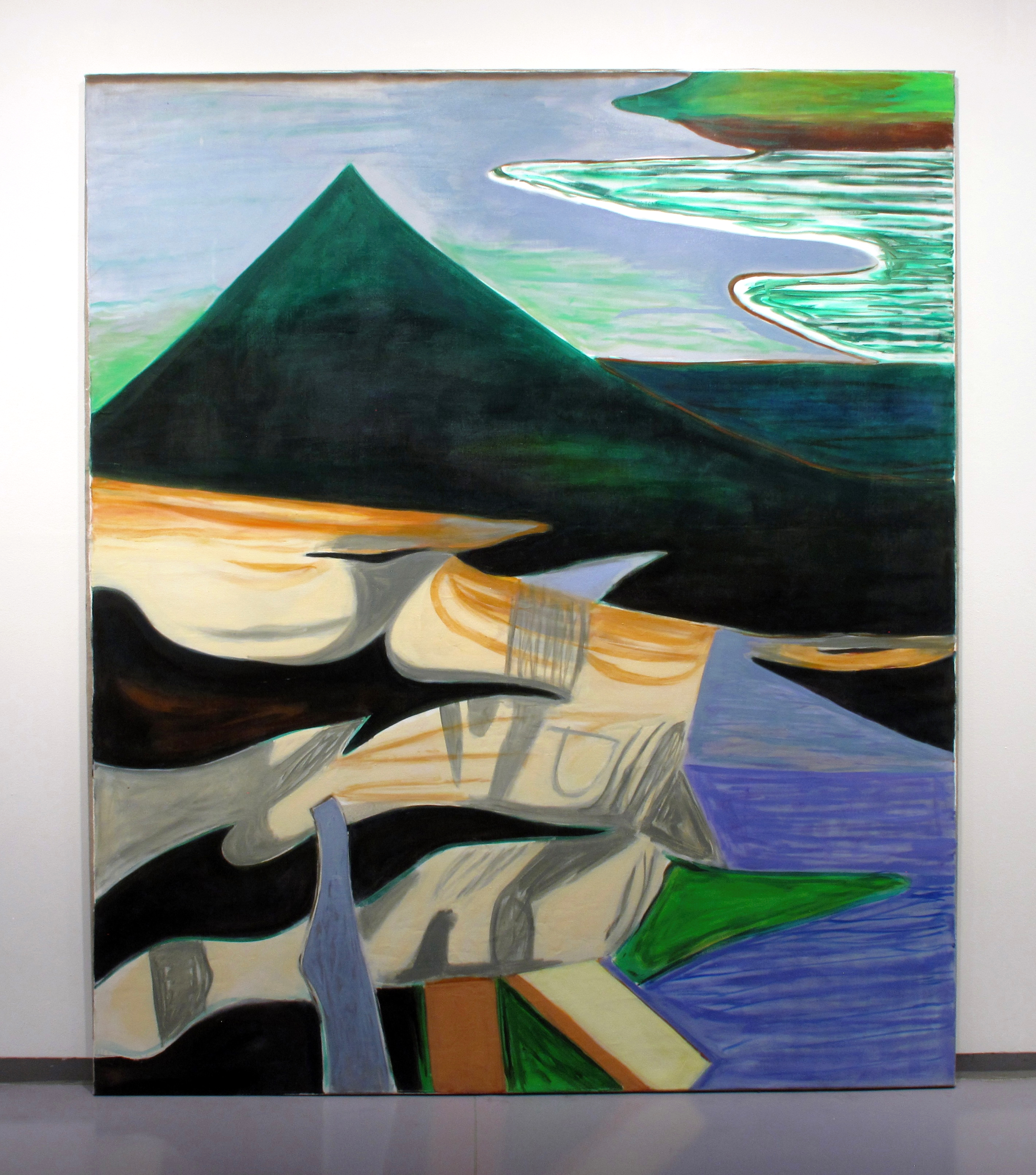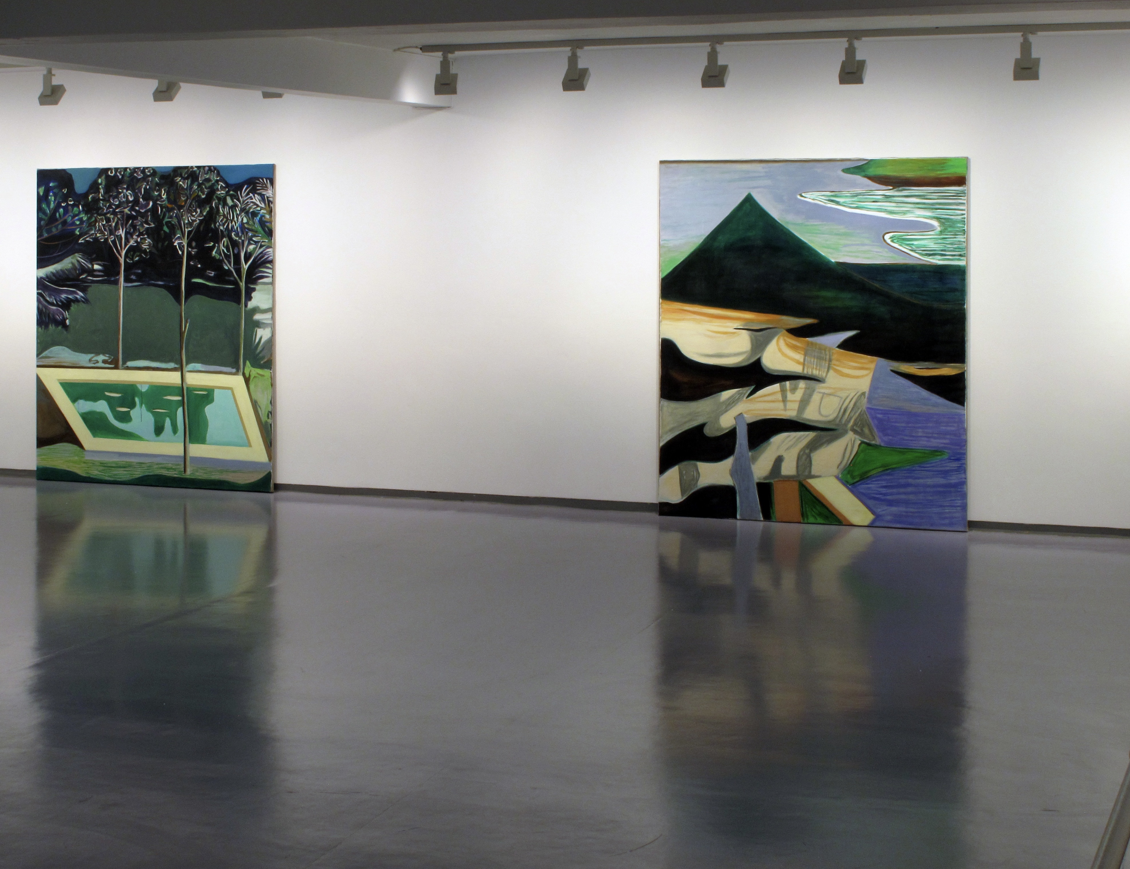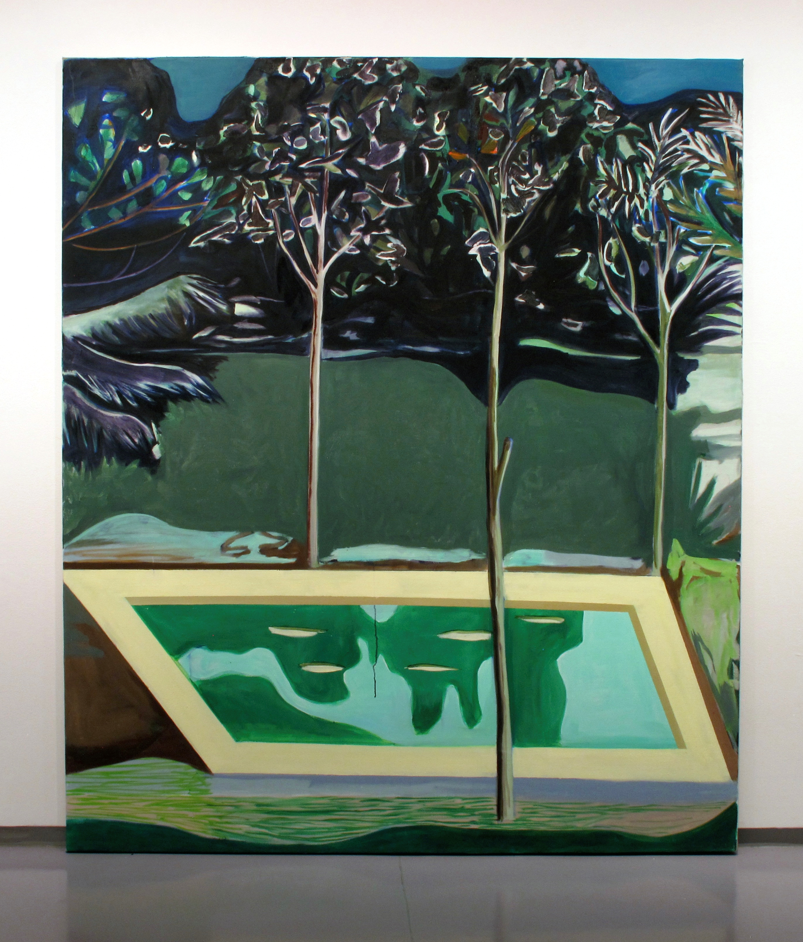 I am in my studio in the attic of the house, listening to the humming sound of a football stadium. I made a painting using a fresco called La Peche as a model. In the painting, people are bathing in a small pool on the edge of a forest but I have removed people from the picture. The painting is standing there as I am working with drawings and with a screen. I am spending time staring at it in the studio through the spring and the summer.